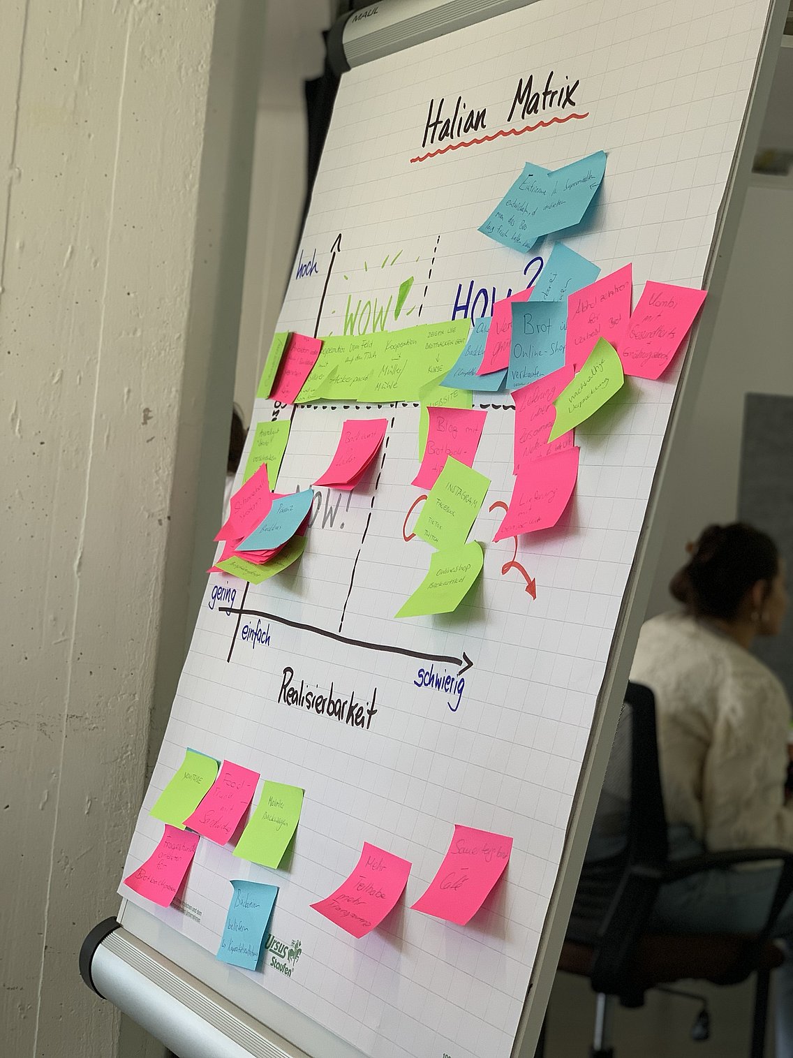Ein weiteres Gedankenspiel, das den Teams dabei hilft, sich in die neue Herangehensweise einzufinden, ist die “Monetarisierung der Kuh”. Aufgabe ist, sich zu überlegen, wie Geld mithilfe einer Kuh verdient werden kann, ohne ihre Milch, ihre Haut o.ä. zu verkaufen. Eine Kostprobe der Monetarisierungs-Möglichkeiten, die den Teilnehmenden einfallen, gibt Einblick in den Ideenreichtum und lässt schmunzeln: Vom Kuhfluencer (eine Kuh als Influencer), Stromerzeugung mithilfe von Kühen und Therapie-Kühen über lebendige Rasenmäher bis hin zum Verleih der Kuh für “Test-Bauern” ist Vieles dabei.