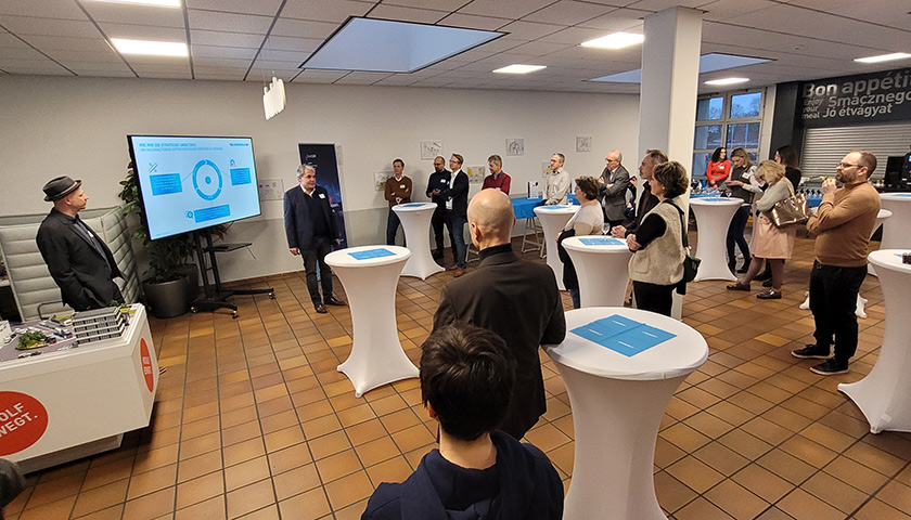 Zunächst ein Blick auf das Unternehmen, bei dem bwcon dieses Mal zu Gast sein durfte: Die Mitarbeitenden von MOSOLF hatten eigens die hauseigene Cafeteria freigeräumt und festlich hergerichtet, um über 40 interessierte Gäste willkommen zu heißen. Diese nutzten die Gelegenheit, das Logistikunternehmen besser kennenzulernen und einen Blick hinter die Kulissen zu werfen.